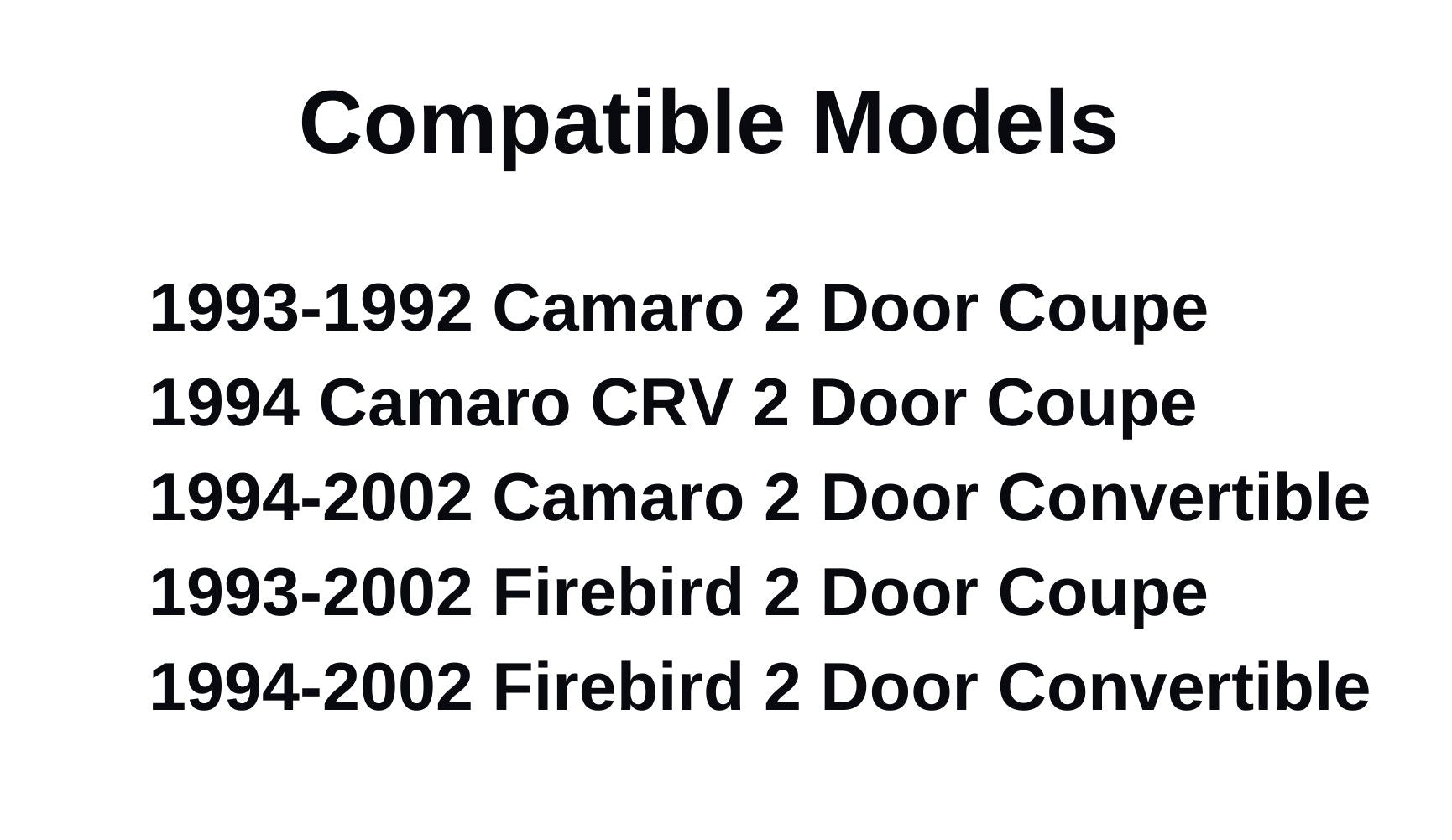 - Compatible Models: 1993-2002 Camaro 2 Door Coupe , 1994-2002 Camaro 2 Door Convertible , 1993-2002 Firebird 2 Door Coupe , 1994-2004 Firebird 2 Door Convertible