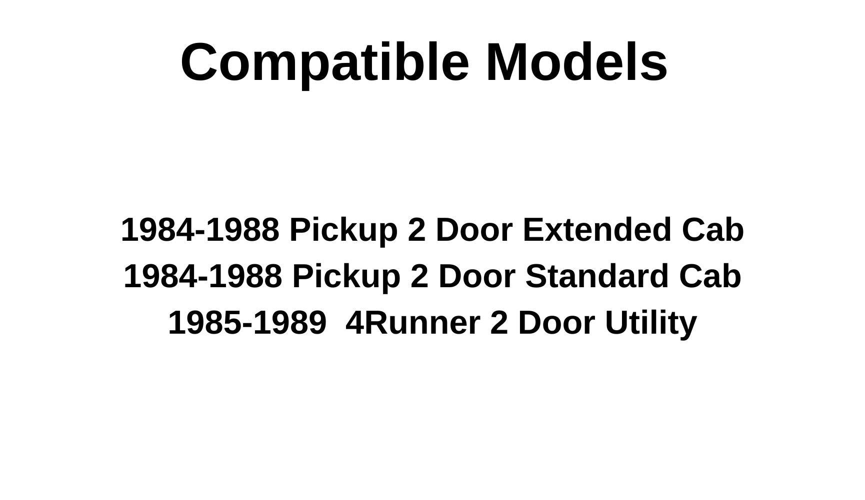 - Compatible Models : 1984-1988 Pickup 2 Door Extended Cab , 1984-1988 Pickup 2 Door Standard Cab , 1985-1989 4Runner 2 Door Utility , ( fits the vehicle style that DOSE NOT have a front vent glass)