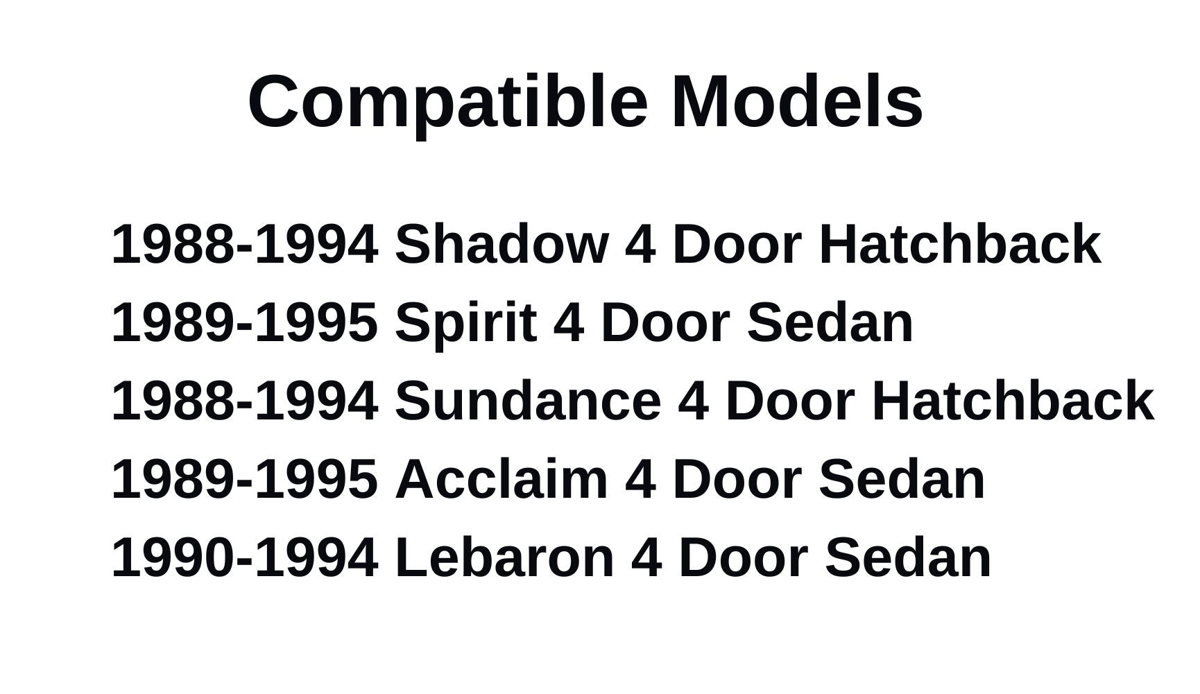 - Compatible Models: 1988-1994 Shadow 4 Door Hatchback, 1988-1994 Sundance 4 Door Hatchback, 1989-1995 Spirit 4 Door Sedan, 1989-1995 Acclaim 4 Door Sedan, 1990-1994 Lebaron 4 Door Sedan