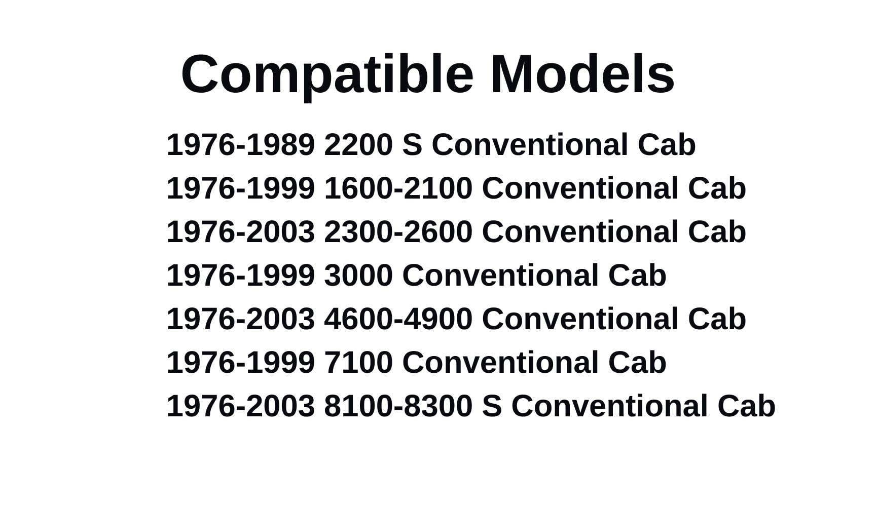 - Compatible Models: 1976-1989 2200 S Conventional Cab , 1976-1999 1600-2100 Conventional Cab , 1976-1999 3000 Conventional Cab , 1976-1999 7100 Conventional Cab , 1976-2003 2300-2600 Conventional Cab , 1976-2003 4600-4900 Conventional Cab , 1976-2003 8100-8300 S Conventional Cab