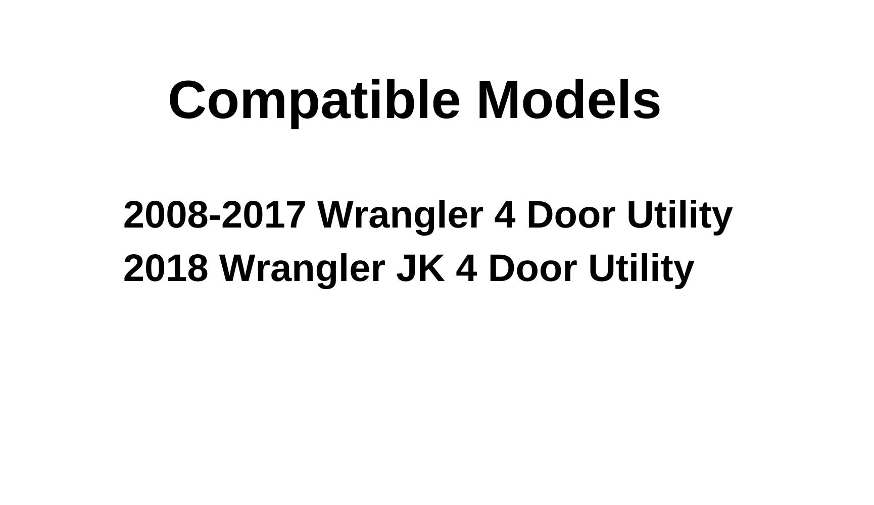 - Compatible Vehicles: 2008-2017 Wrangler 4 Door Utility , 2018 Wrangler JK 4 Door Utility