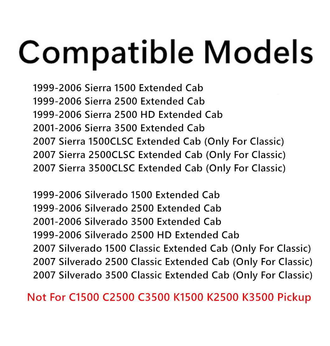 - Compatible Models: 1999-2006 Sierra (1500, 2500, and 3500) Extended Pickup , 1999-2006 Silverado (1500, 2500, and 3500) Extended Pickup, 2007 Sierra 1500Classic Extended Pickup, 2007 Silverado 1500Classic Extended Pickup, 2007 Sierra 2500Classic Extended Pickup, 2007 Silverado 2500Classic Extended Pickup, 2007 Sierra 3500Classic Extended Pickup, 2007 Silverado 3500Classic Extended Pickup