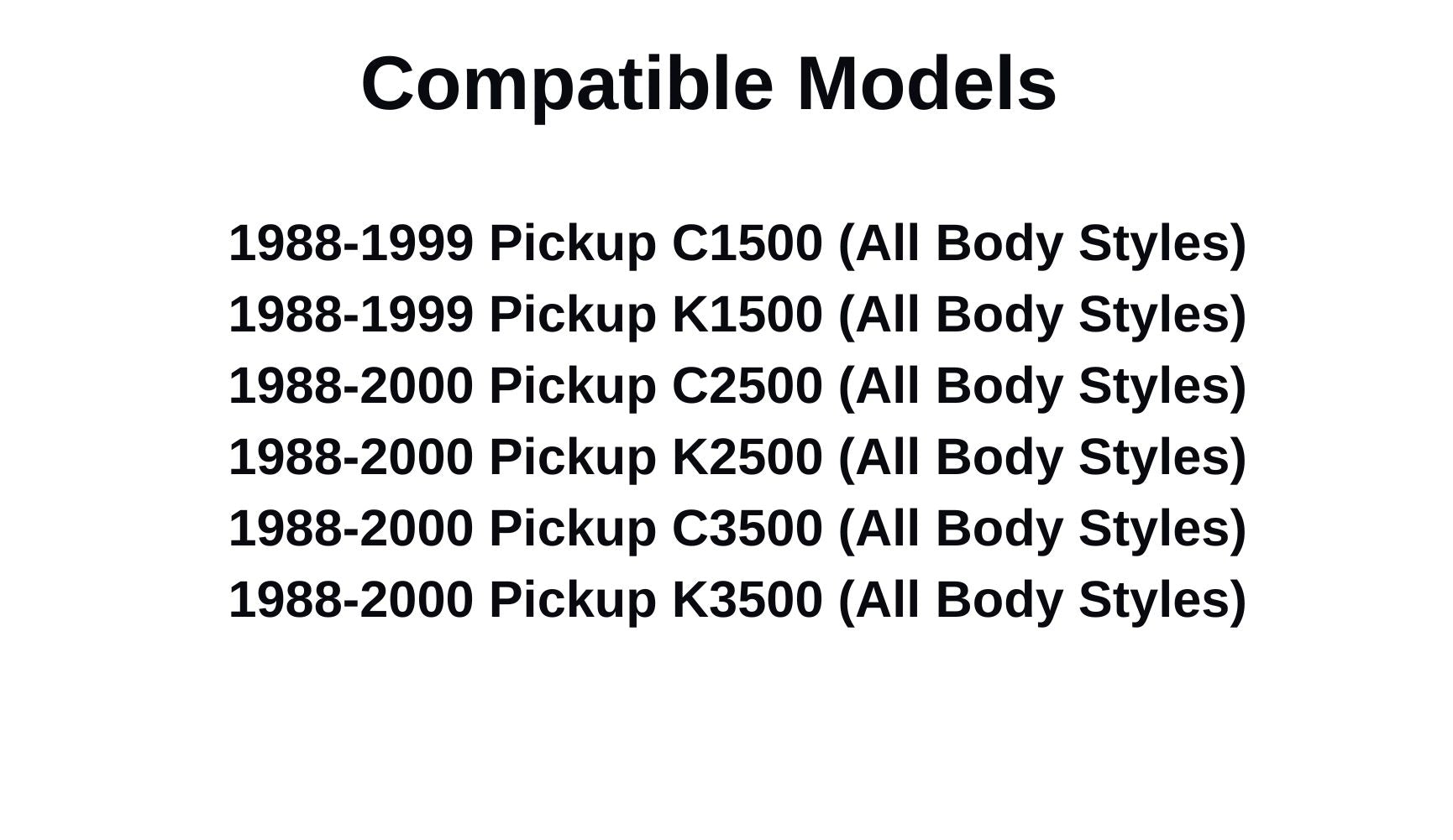 - Compatible Models: 1988-1999 C1500 Pickup , 1988-1999 K1500 Pickup , 1988-2000 C2500 Pickup , 1988-2000 K2500 Pickup , 1988-2000 C3500 Pickup, 1988-2000 K3500 Pickup